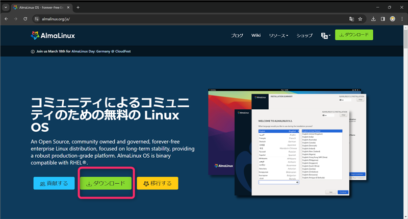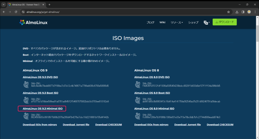 AlmaLinux9のダウンロード