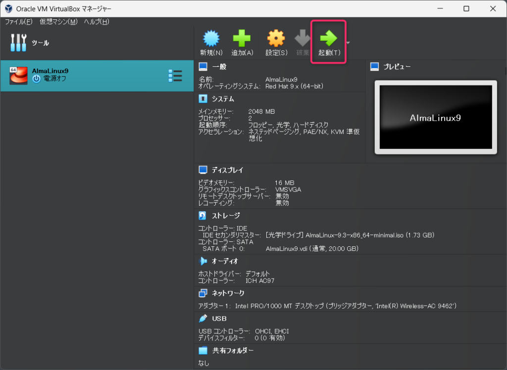 次回からAlmaLinux9を起動する場合は、VirtualBoxを開いて起動を押します。