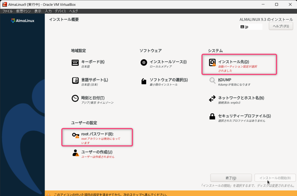 インストール先とrootパスワードの設定が完了したら、インストールの開始を押します。