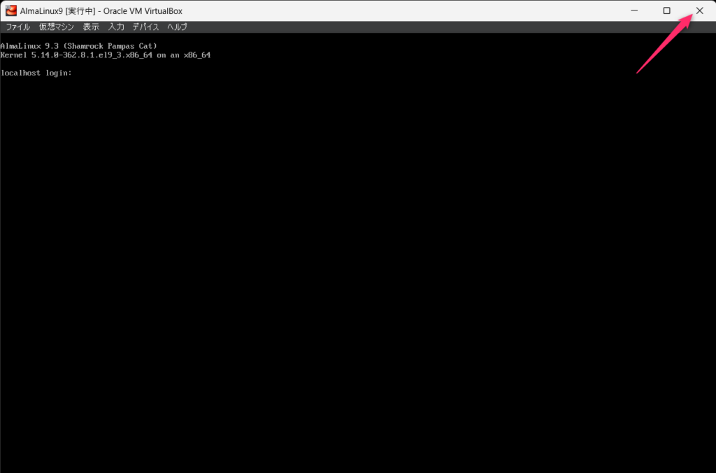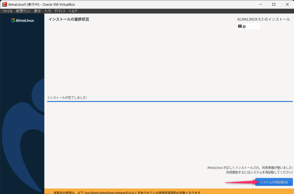 VirtualBoxの仮想マシンへのAlmaLinux9のインストールが完了しました。
