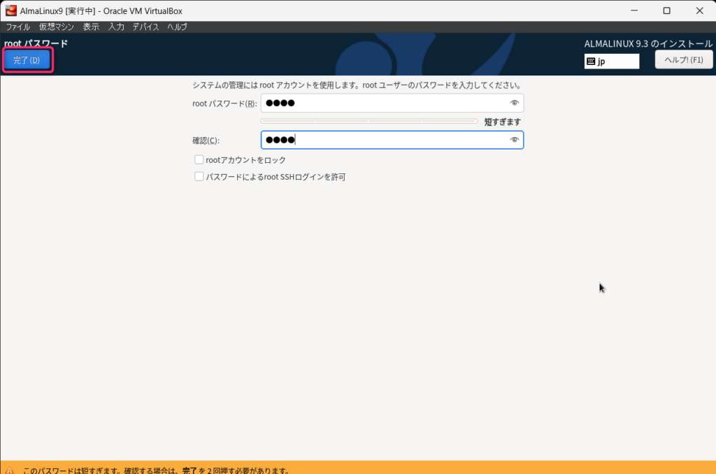 簡単なパスワードや脆弱なパスワードを設定することもできますが、その場合は完了ボタンを2回押す必要があります。