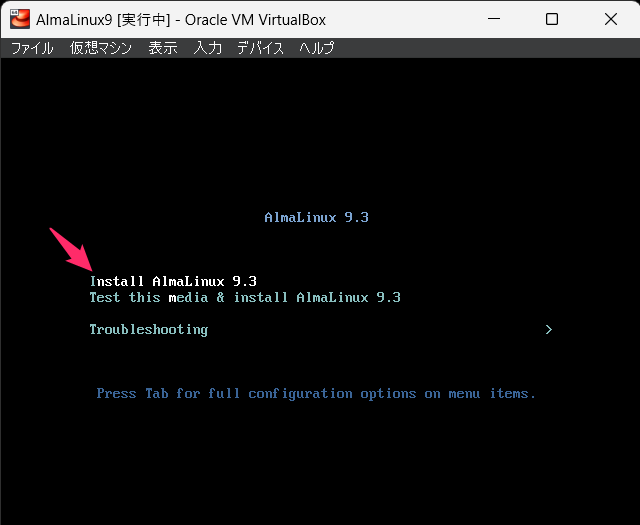 Install AlmaLinux 9.3を選択して、エンターキーを押します。