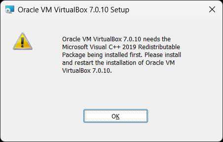 VirtualBoxではMicrosoft Visual C++ 2019 Redistributableパッケージが必要なのですが、入っていない場合は以下のようなエラーメッセージが表示されます。