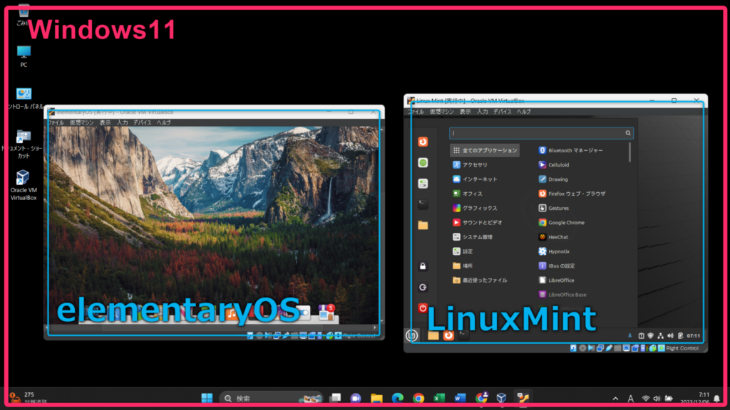 以下の画像はVirtualBoxを実際に利用しているところです。Windows11の中でelementaryOSとLinuxMintを動かしています。このように一度に複数のOSを同時に動かすこともでき、新しいOSを試す場合やLinuxを学習する際には非常に便利です。