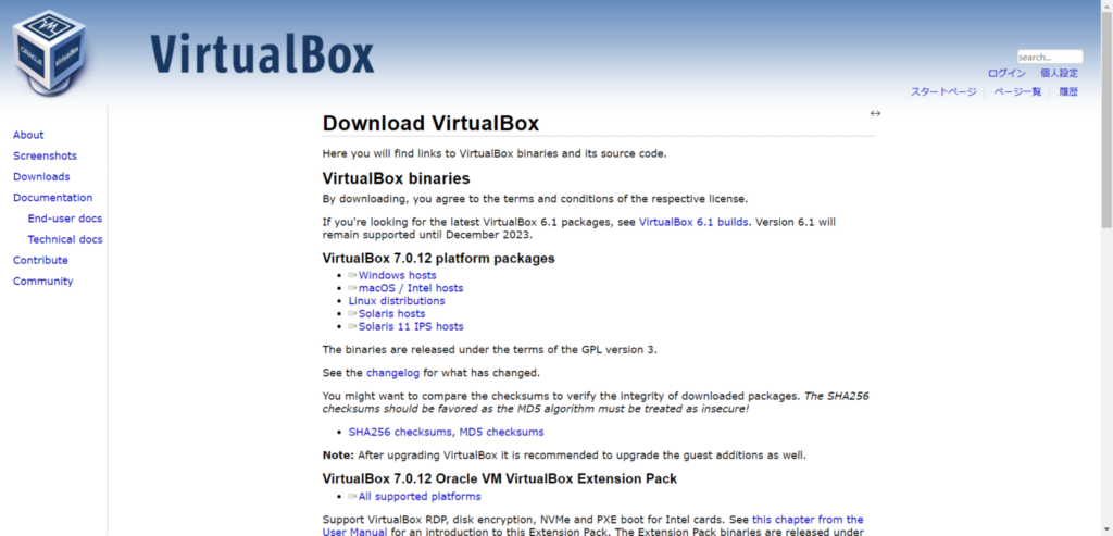 まずはVirtualBoxのページからソフトをダウンロードします