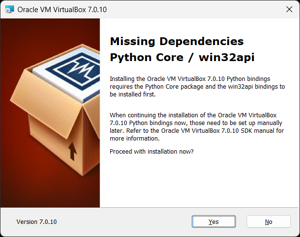 VirtualBoxではPythonを使って仮想マシンを制御する機能があり、Pythonのインストールをしていない状態でVirtualBoxをインストールしようとするとMissing Dependencies Python Core / win32apiと表示されます。