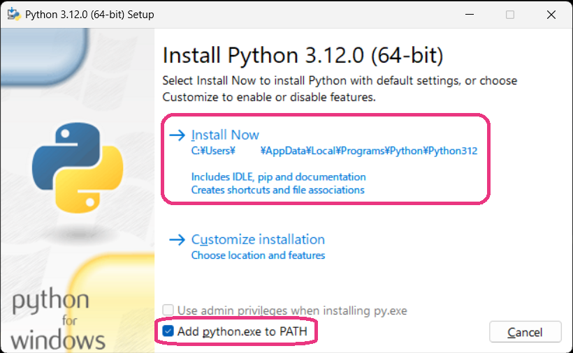 Add Python.exe to PATHにチェックを入れてInstall Nowを押します