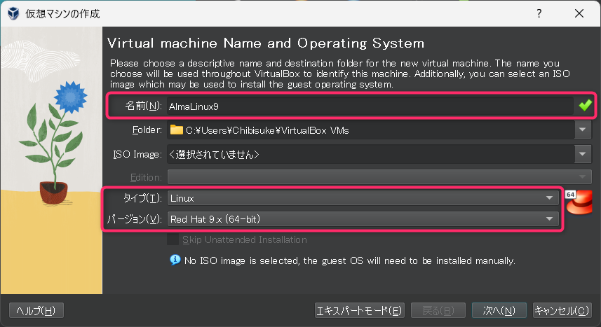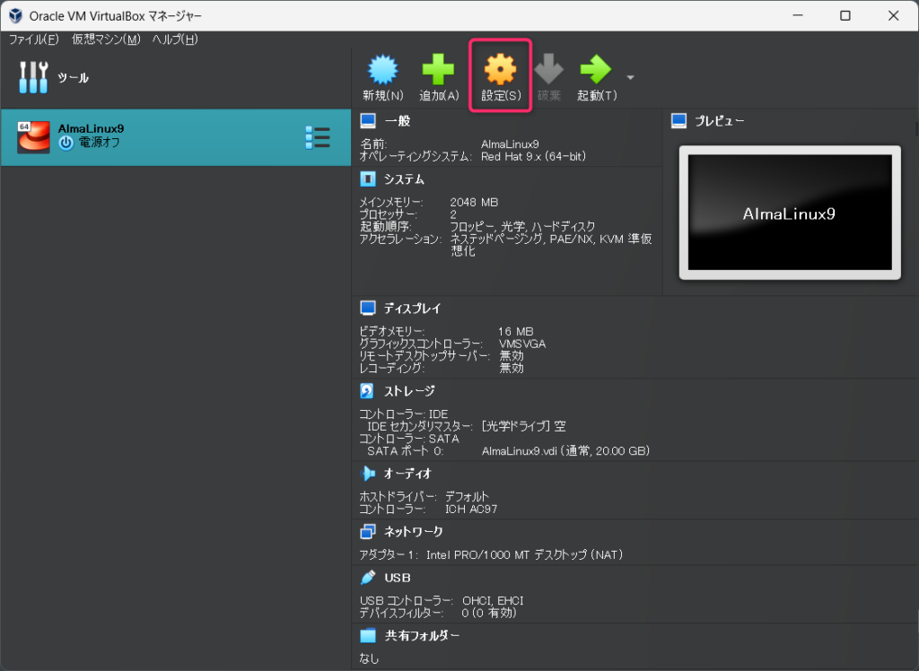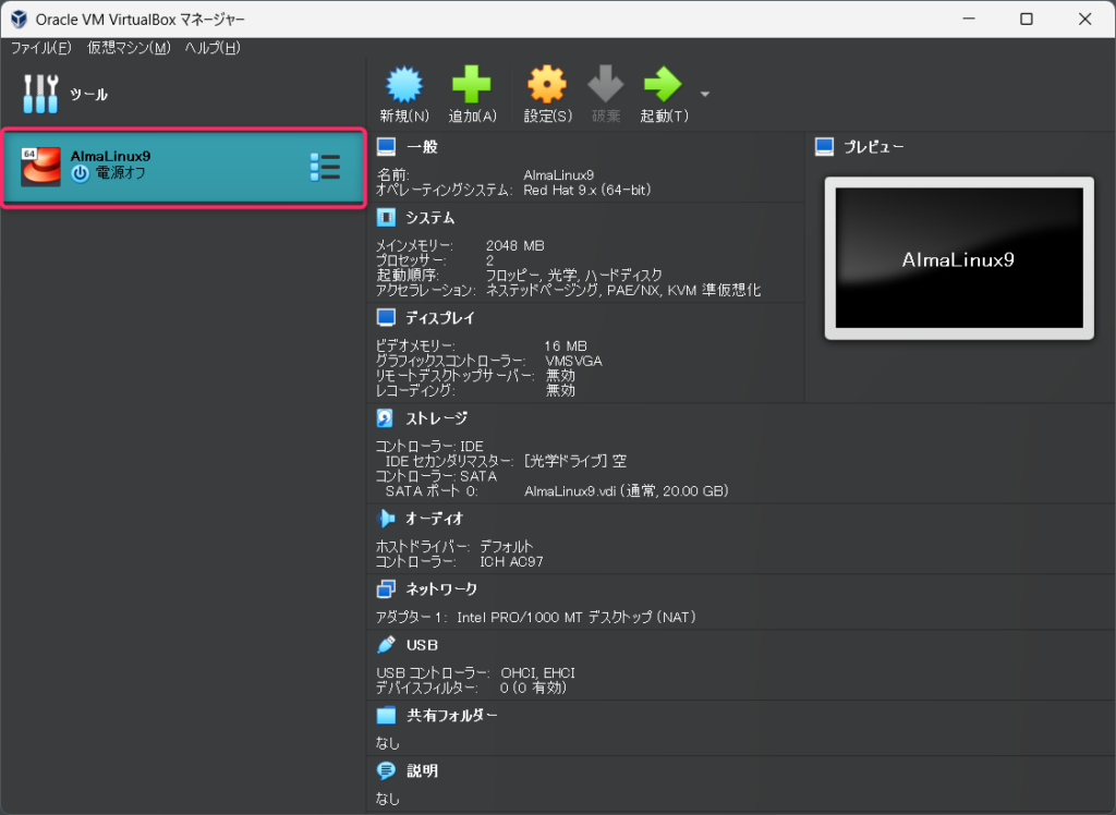 VirtualBoxでAlmaLinux9をインストールするための仮想マシンをセットアップしていきます。