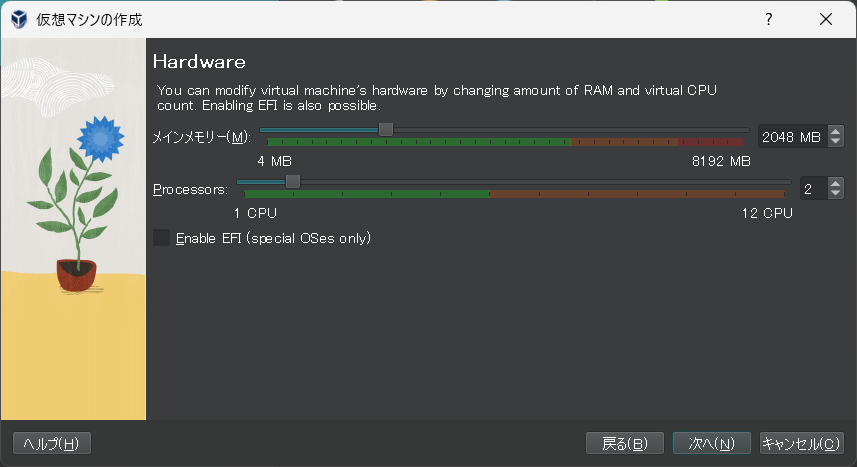 続いては仮想マシンに割り当てするメモリの量とCPUの数を選択します。