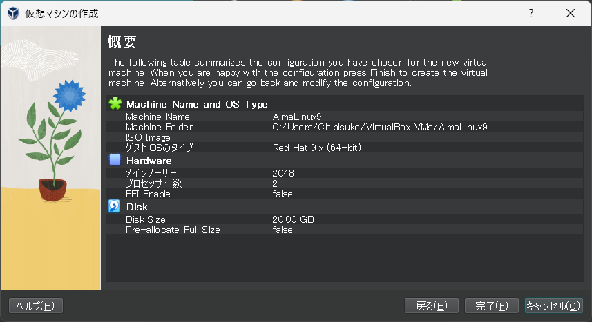 仮想マシンの名前、CPU、メモリ、ハードディスク容量を確認して問題なければ完了を押します