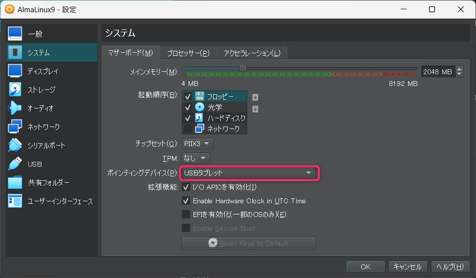 ポインティングデバイスをUSBタブレットにします。