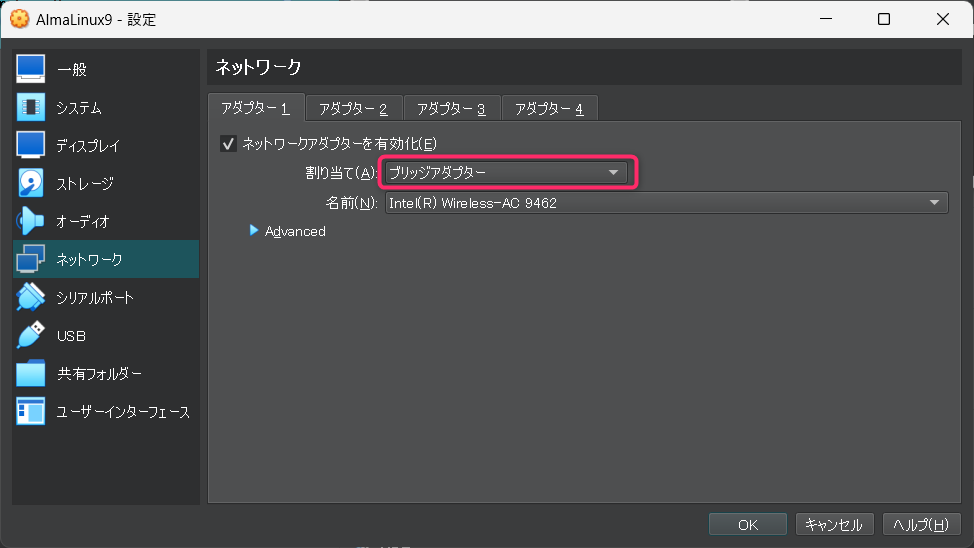 続いてネットワークの設定ですが、デフォルトではNATとなっていますが、ブリッジアダプターに変更します。