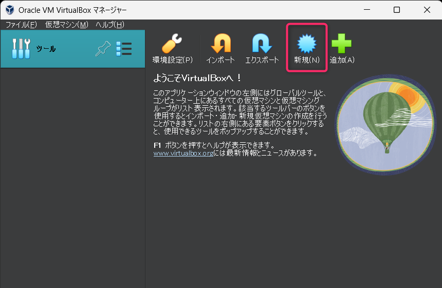 VirtualBoxを起動して新規を選択します。